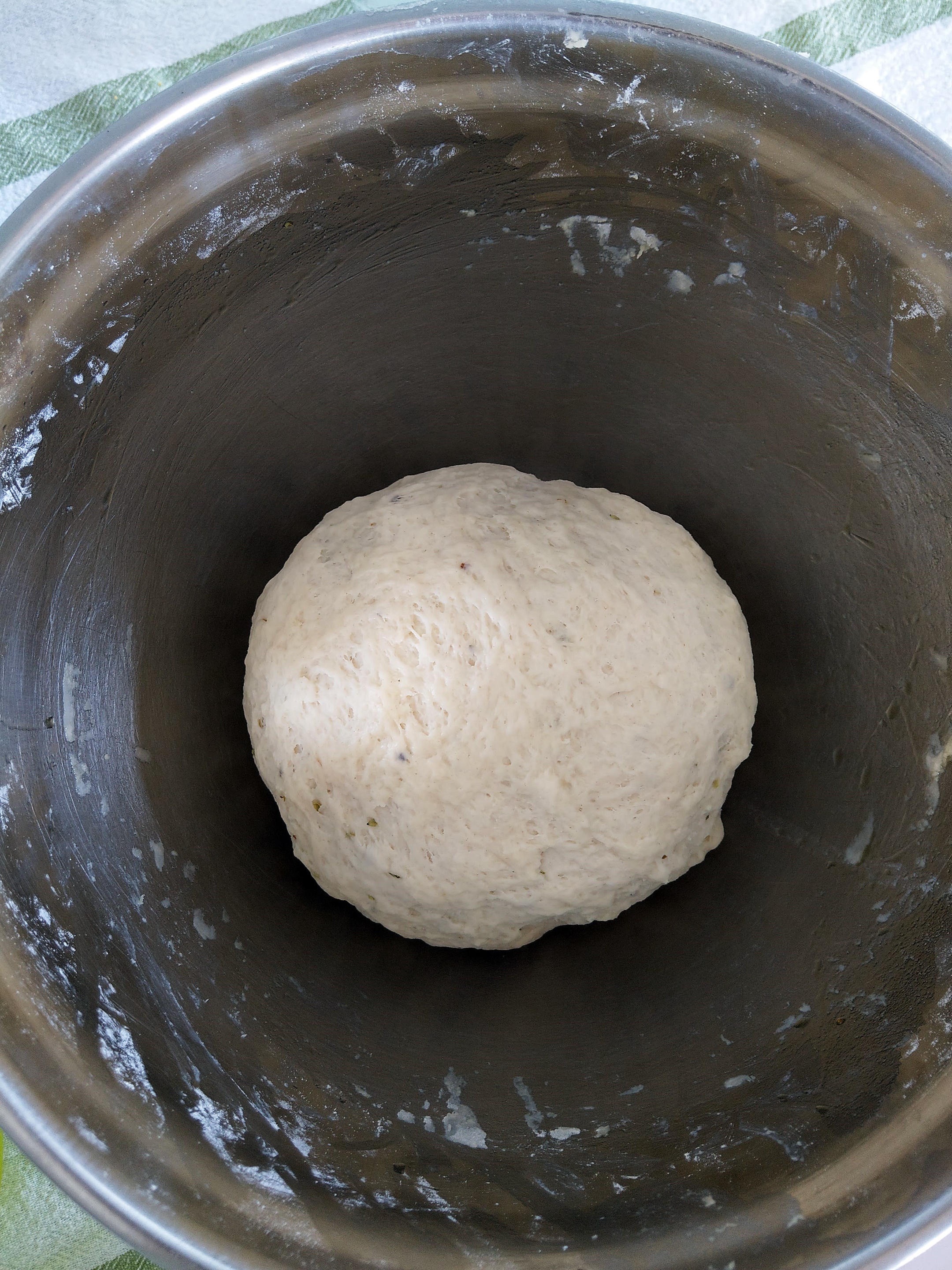 3. Add 70 ml warm water and knead the dough for 10 minutes, definitely by hand. Add 3 teaspoons sea salt dissolved in 4 tablespoons of warm water. Knead for the next 10 minutes. At the end add 3 tablespoons olive oil and some oregano and cover with a damp cloth. Let the dough rise for about 2 hours.